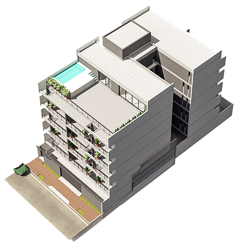 En los 5 niveles superiores, se encuentran pisos de 5 departamentos cada uno, con 1, 2 y 3 dormitorios, baño completo y toilette, ámplia cocina de concepto abierto con el living comedor y balcones con parrilla.