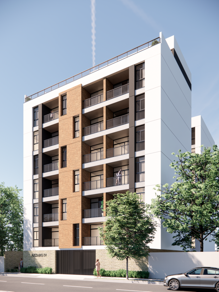 Ubicado en un terreno entre medianeras, se presenta la Torre Azzaro IV, proyecto de una torre residencial de 6 plantas, que sigue criterios de aprovechamiento bioclimático, funcional y espacial, todo esto aplicado en una arquitectura que mezcla conceptos formales contemporáneos y uso de materiales locales.